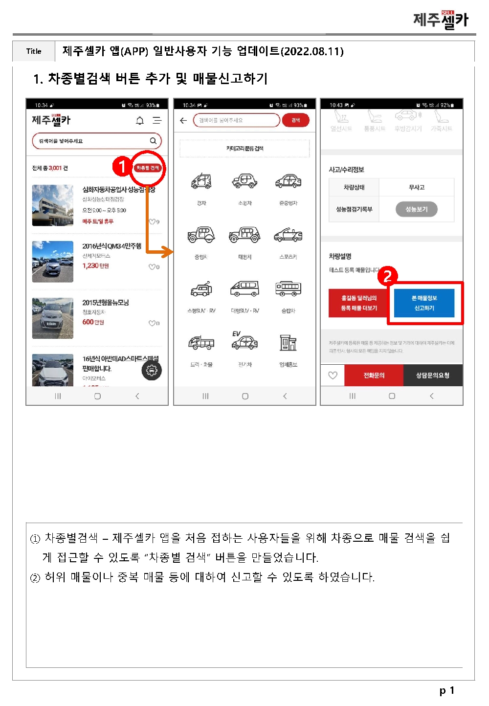 ① 차종별검색 – 제주셀카 앱을 처음 접하는 사용자들을 위해 차종으로 매물 검색을 쉽게 접근할 수 있도록 “차종별 검색” 버튼을 만들었습니다.
